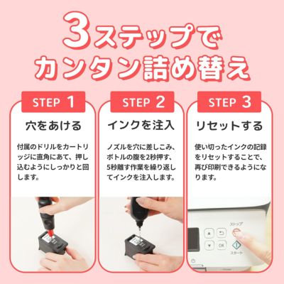 ①純正カートリッジを外す②カートリッジに穴を開けてインクを注入する③カートリッジをセットする④プリンターを操作してインク残量をリセットするの4ステップです。詳しい詰め替え方法はビギナーセット同梱の説明書をご覧ください。