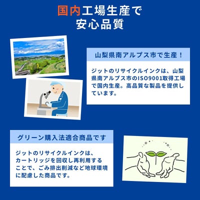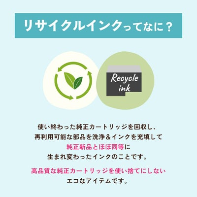 使用済みの純正インクカートリッジを回収し、再生工場にて洗浄やインク充填をしたうえで、再度販売している商品です。純正品に比べて、印刷代を節約することができます。