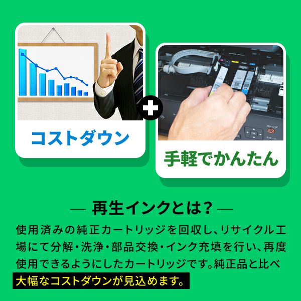 リサイクルインクカートリッジは、純正品のインクカートリッジを再利用し、インクを補充しなおした商品で、詰め替えインクは、純正品のインクカートリッジに補充するための中身のインクです。