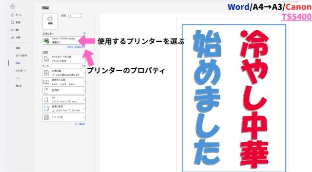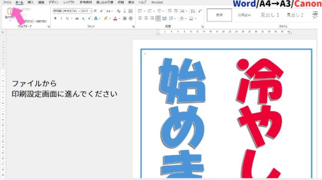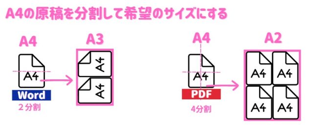 Wordなどで作成したA4原稿を2分割して印刷すれば、A3サイズのポスターが完成します。4分割して印刷すれば、A2サイズのポスターが完成します。