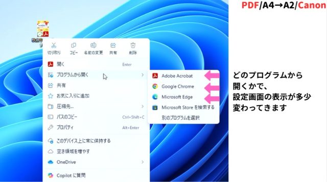 ブラウザ(Edge)で開き、印刷アイコンをクリックします。