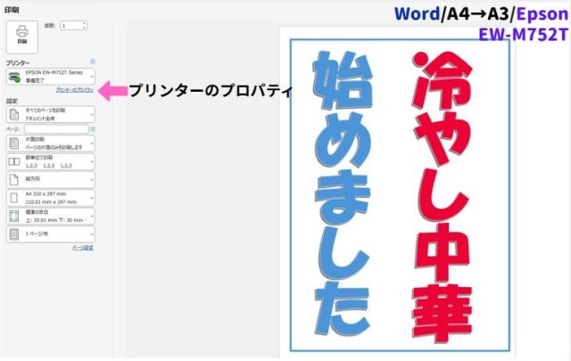 「プリンターのプロパティ」をクリックします。使用するプリンターを選びます。