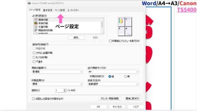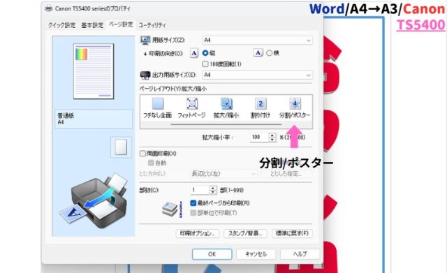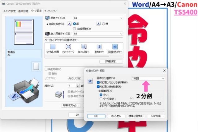 キヤノンの場合:この後は先ほどと同様に、「プリンターのプロパティ」→「ページ設定」→「分割/ポスター」の手順で進めます。