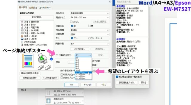 エプソンの場合:この後は先ほどと同様に、「詳細設定」などから「ページ集約/ポスター」のドロップダウンリストを確認します。