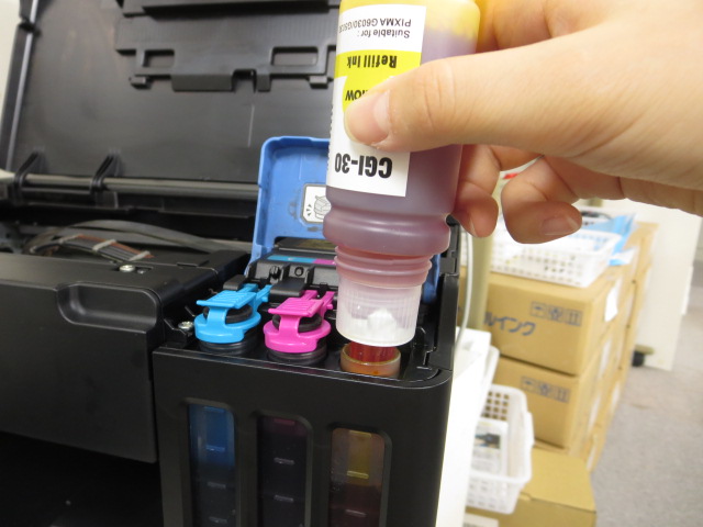 インクの詰め替え方法は、インク吐き出し口からインクを挿して補充する方法です。少しインクが入りにくい構造なのでエプソンやキャノンに比べると手間がかかります。