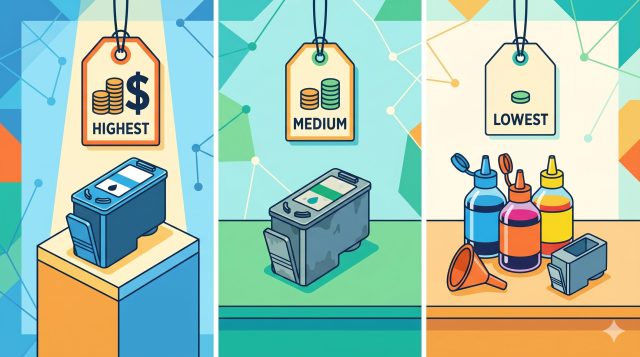 インクの選択肢は大きく3種類あります。純正品・再生インク(リサイクルインク)・詰め替えインクのどれを選ぶかで、印刷コストは大きく変わります。