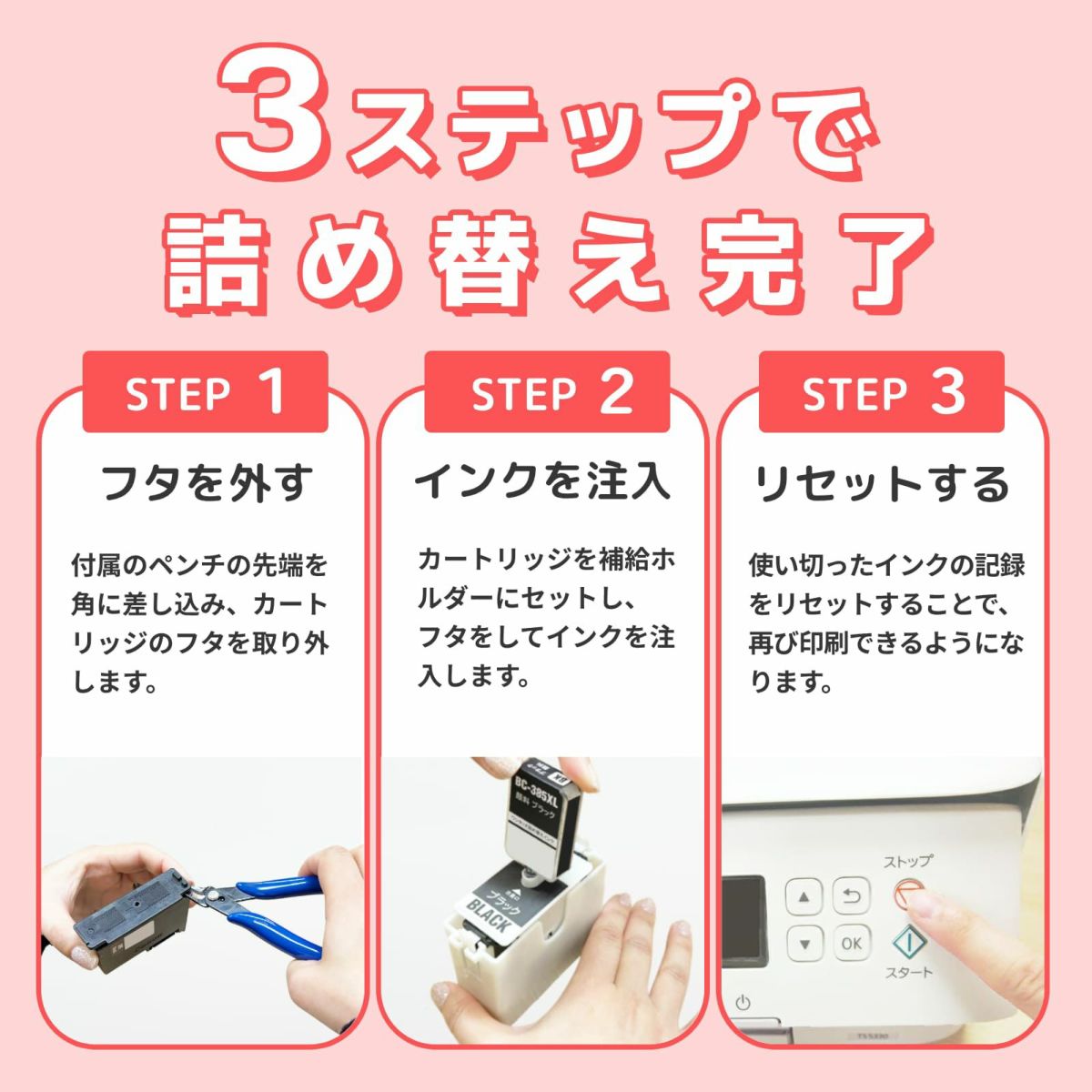 他の画像を見る BC-385 BC-386/BC-385XL BC-386XL Canon(キヤノン/キャノン) 純正用詰め替えインク ビギナーセット 30ml×4本 TS6630 TS6730/TS5500(BC-395 対応) TS5530 インク 初回ビギナーセット 詰め替え用 30mlタイプ 当店通常価格 ¥ 6,468 税込 カートに入れる お気に入りに登録する (0件)